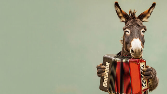 A photo of, a donkey stubborn playing a accordion, isolated on a light olive green background