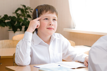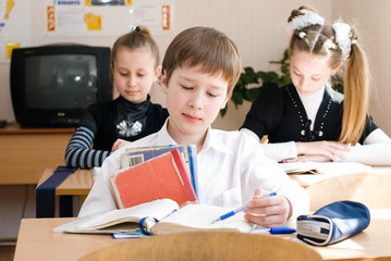 Education concept. Hello, Autumn. In the foreground is an open book with an orange oak leaf between open heart-shaped pages. Back to school. Couple of students in the background out of focus