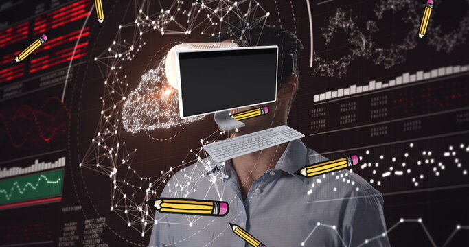 Image of diverse data and screen over caucasian man in vr headset and digital padlock