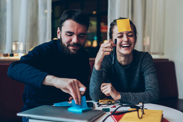 Joyful male and female sitting in campus and playing good positive game while waiting friends at cafeteria, successful caucasian studends having fun after doing homework indoors laughing at joke