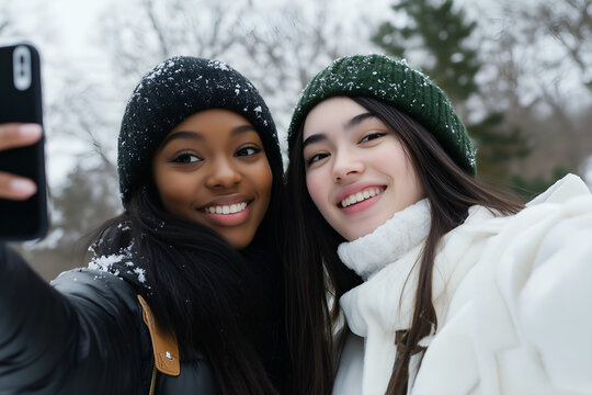 Cheerful Winter Selfie of Two Smiling African and Asian Multicultural  Friends in Snow-Covered Beanies and Coats Amid Snowy Trees on a Cloudy Day