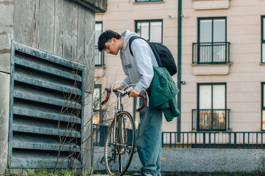 Handsome young man with bicycle in city, Smiling student men outdoor portrait, Active lifestyle, people, city life, having fun, casual business concept