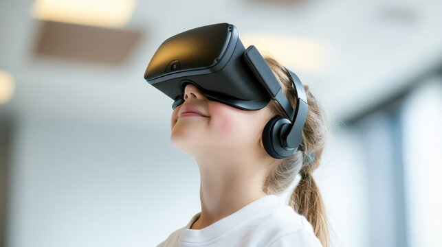 Child engaged in virtual reality learning experience in classroom, with teacher and fellow students in background creating an immersive educational atmosphere