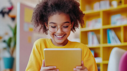A cheerful boy in yellow attire happily engages with a tablet while surrounded by classmates in a classroom setting.