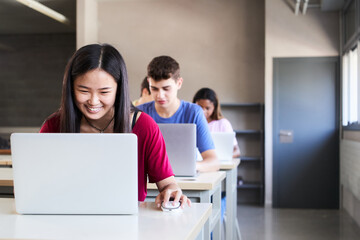 Multiracial group of high school students in the classroom using laptop computers. A smiling Asian girl studies through digital media in new technologies.