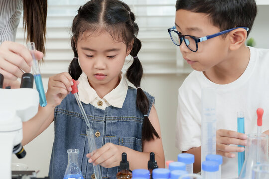 Asian elementary students using pipettes to transfer liquid between glassware during science experiment with guidance from female caucasian teacher inside classroom full of lab equipment