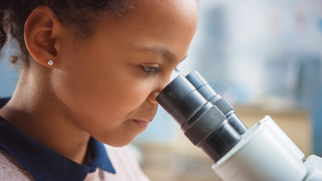 Portrait of Smart Little Schoolgirl Looking Under the Microscope. In Elementary School Classroom Cute Girl Uses Microscope. STEM (science, technology, engineering and mathematics) Education Program