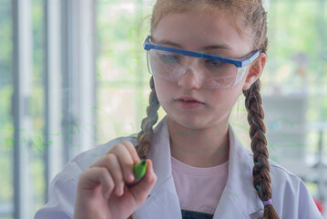 schoolgirl study science subjects and use marker write on board glass