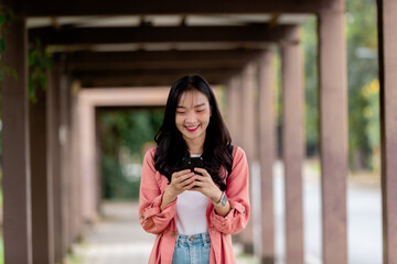Smiling student uses smartphone in modern library