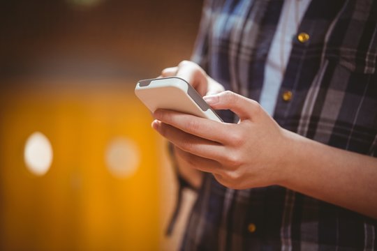 schoolgirl leaning against lockers in a corridor using a smartphone