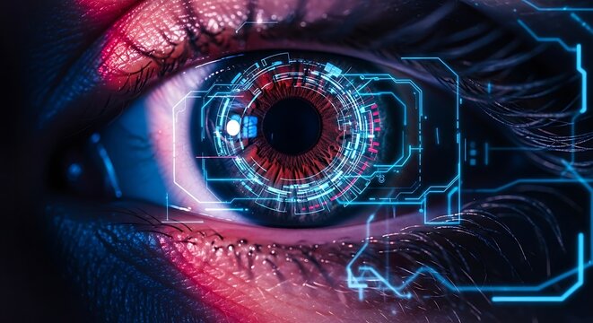 Close up of a futuristic cyborg eye with glowing circuits and a hud interface, showcasing advanced technology and data analysis