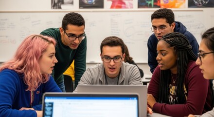 Diverse students collaborating with laptop in classroom