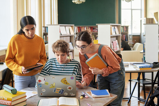 Elementary students collaborating around laptop in school library, teamwork and curiosity