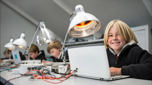 Young students record temperature changes during hands-on physics experiment in real time. Sensors and laptops help visualize data. Future education.