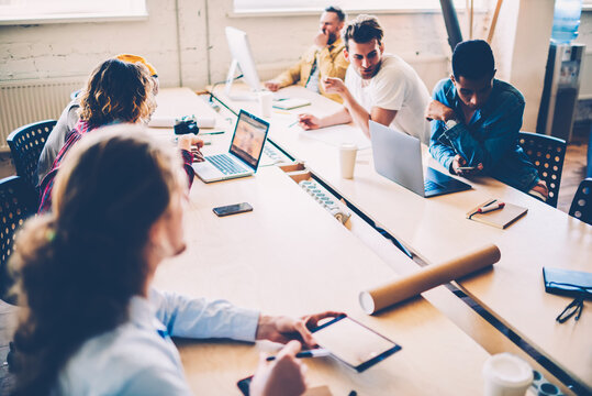 Male and female designers having informal meeting discussing working project in coworking office, crew of multiracial students sitting at table during training lesson completing task collaborating