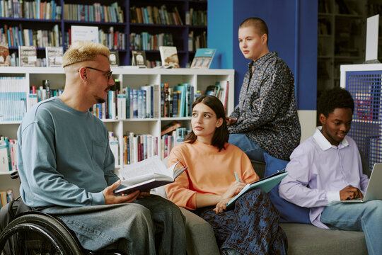 Group of young diverse students collaborating and studying with books and laptops in modern library setting featuring bookshelves and desks. Senior student engaging in conversation