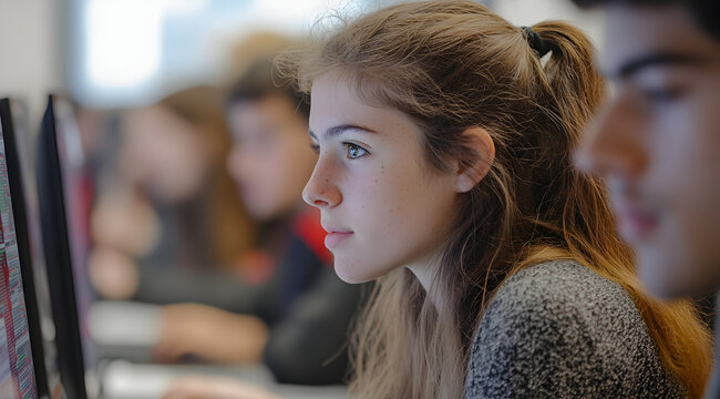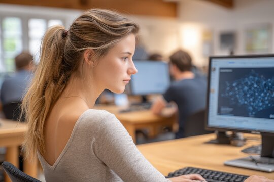 Focused young woman diligently working on desktop computer in modern educational lab, engaging in digital learning complex data analysis. Showcasing dedication, technology, essential skills