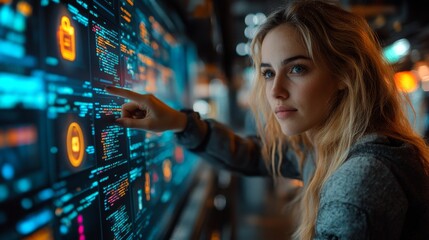 Woman engaged in collaborative programming at a high-tech workspace in the evening