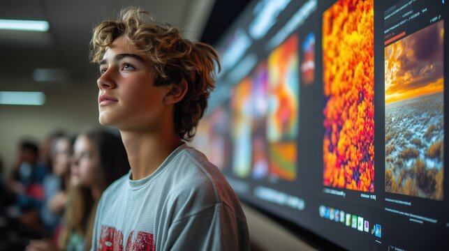 Students Engaged In Collaborative Technology Project With Digital Interface Images