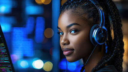 Young Woman Smiling While Working on Computer in a Coding Environment