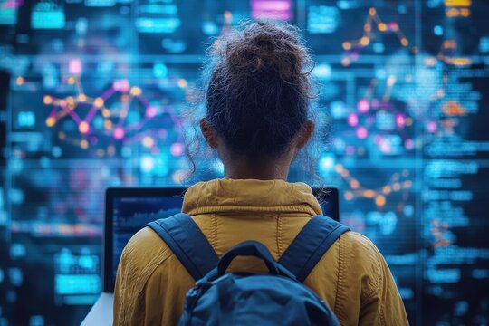 A person sits in front of multiple screens displaying data analysis, engaged in a learning or training environment.