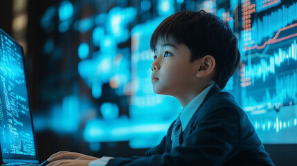 Young person engaged in data analysis in a modern tech workspace filled with vibrant digital displays
