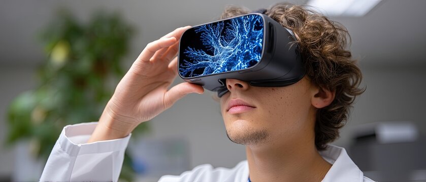 Virtual Learning Adventure: A young girl wearing a VR headset interacts with a holographic brain, exploring the exciting world of virtual education.