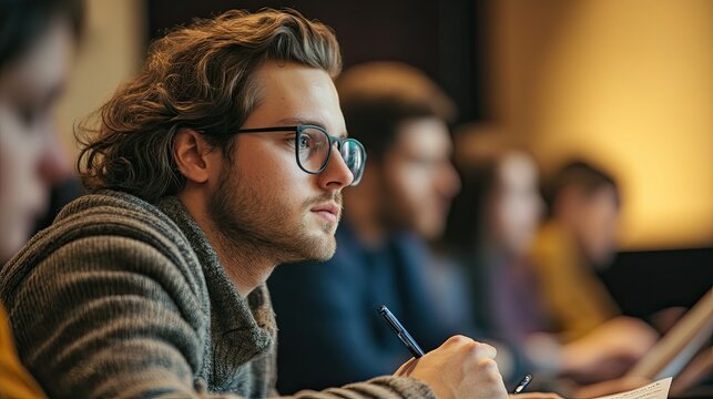 Close-up of a  female student writing in a notebook while sitting at a desk in a classroom. She appears focused on taking notes during the class