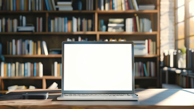A laptop mockup in the school library. There is an open laptop on the table in front of the bookshelf. The bookshelf is filled with books