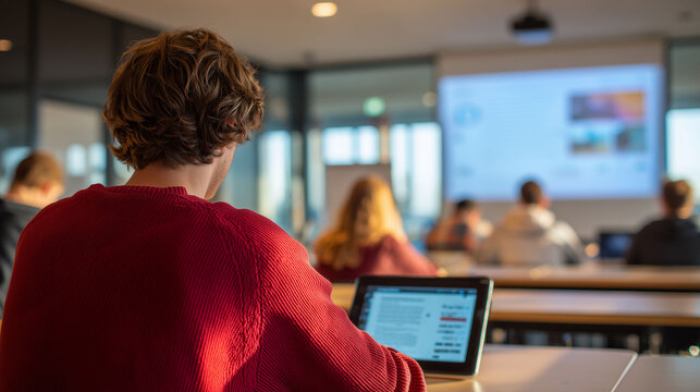 College Student attending lecture using tablet computer in modern classroom symbolizing digital learning technology education innovation and academic development concept