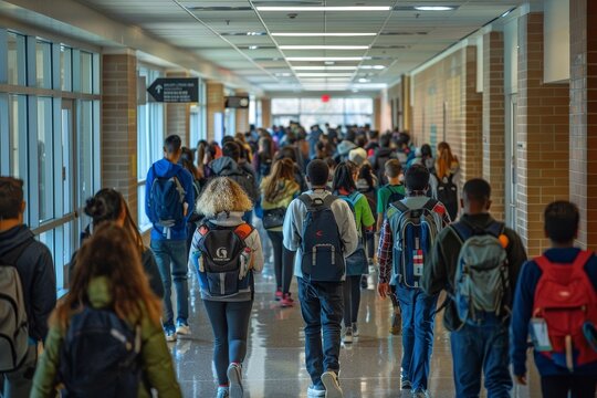 A large group of people, including students, walking down a bustling hallway, A bustling hallway filled with students of different ages and backgrounds