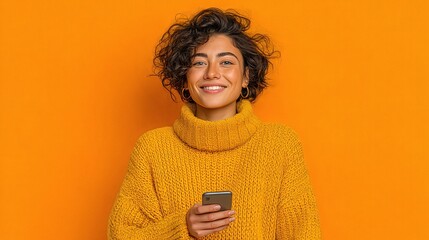 Woman uses smartphone while wearing glasses and a cozy sweater against a pink background in a bright studio setting
