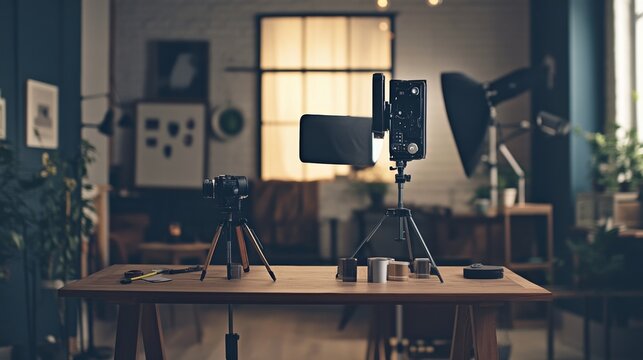 Professional camera equipment setup in creative photography studio environment with tripods lighting and backdrop scene