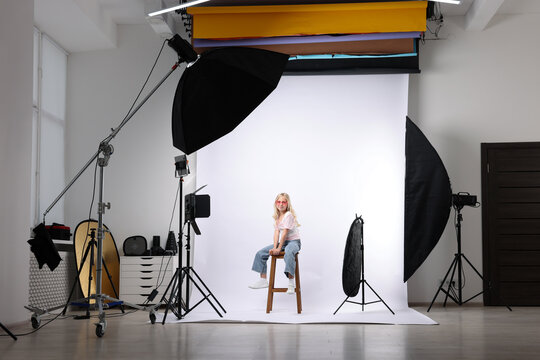 Silhouette people working in studio with equipment and lighting for making movie or commercial