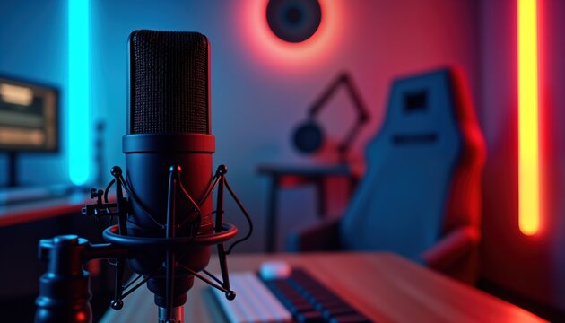 Empty podcast studio interior with neon lights. Pro audio equipment including black microphone. Modern media broadcasting room. Empty workspace ready for host speaker. Suitable for recording podcast