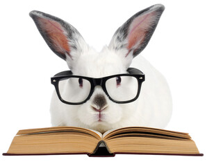A white rabbit wearing black glasses rests its head on an open book, appearing studious and focused.