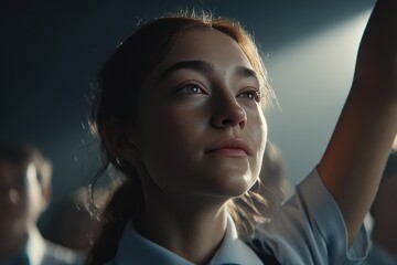 Determined High School Student Raising Hand During Classroom Discussion, Emphasizing Focus and Participation