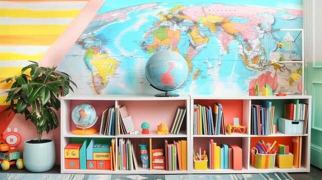 A bright and cheerful study area with a meticulously organized bookshelf holding childrena??s books, a globe showcasing different countries, educational toys, and a small potted plant in the corner