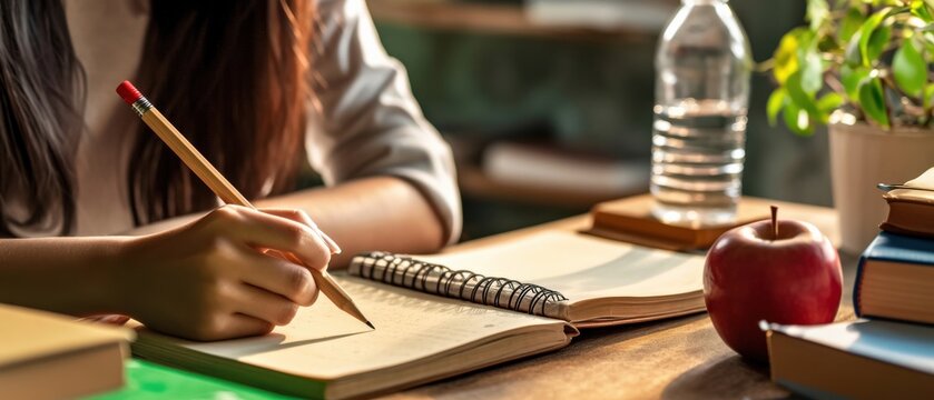 Study session with notes, books, and an apple on the desk. AI-generated.