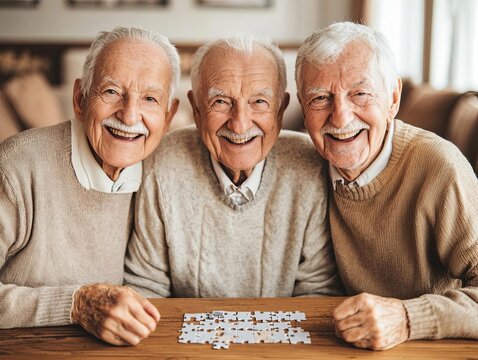 Three elderly men enjoying time together while solving a puzzle at home.