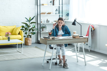 Asian teenage woman sitting in white office with laptop, she is a student studying online with laptop at home, university student studying online, online web education concept.