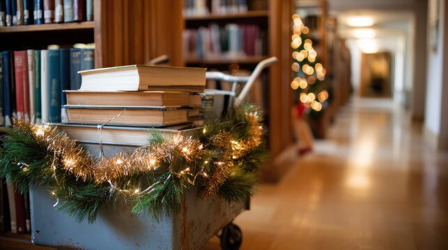 A stack of books topped with glasses sits in a library, creating a cozy atmosphere ideal for reading and studying.