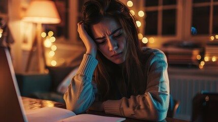 Stressed woman studying late at home in a focused atmosphere