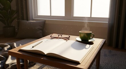Cozy reading corner with open notebook, eyeglasses, and steaming cup of coffee on wooden table near window, warm morning relaxation and study atmosphere