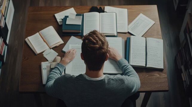Student studying at a desk with textbooks and notes scattered around, focused on preparing for an exam. Determination and hard work in education.