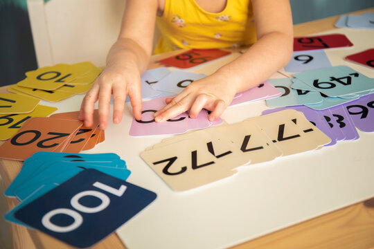 Little caucasian girl studying numbers and math in the classroom, stylish interior for home education, preschool child education, home schooling