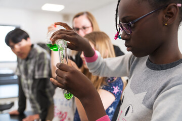 Diverse female teacher and enthusiastic students engaging in science experiment