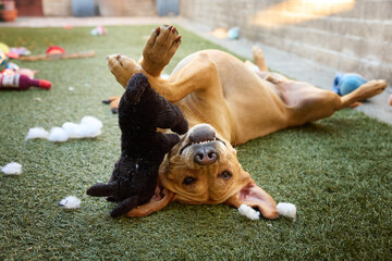 Dog smiling upside down with stuffy