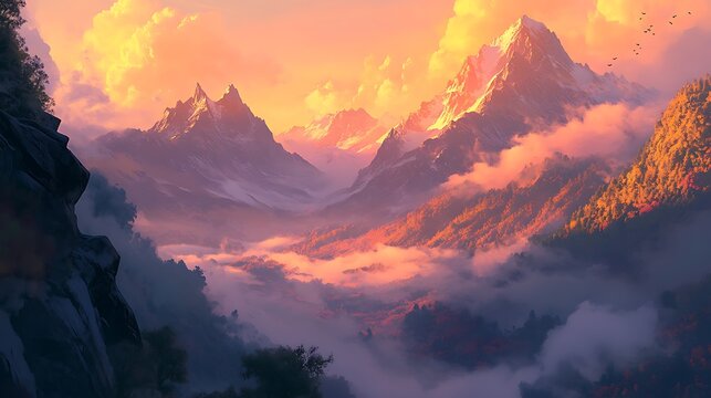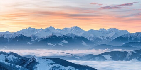 Stunning sunset over mountain range with clouds and fog blanketing valley for breathtaking view of majestic peaks peaceful serene scenic natural landscape atmospheric concept