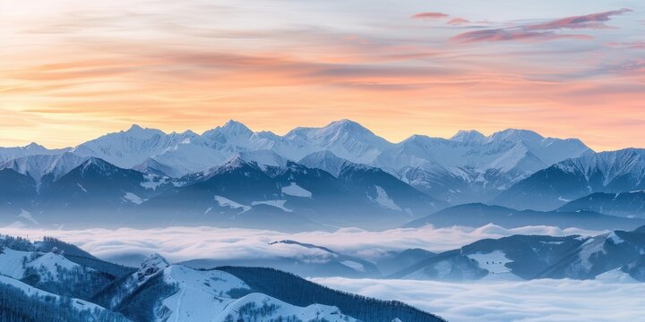 Snowy mountain range at dawn.  Vast winter peaks covered in snow, vibrant colors of sunrise